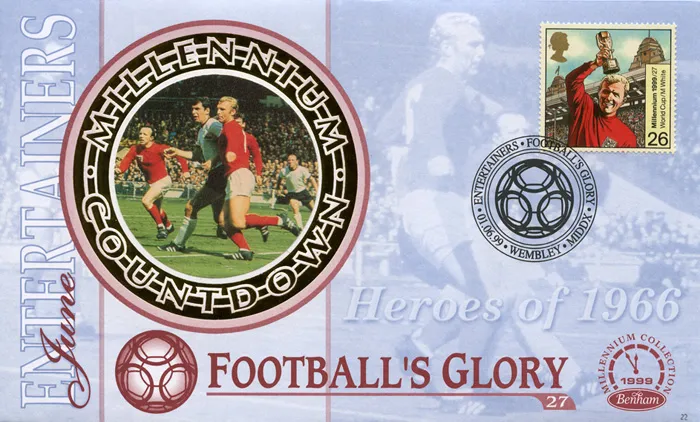 The above Royal Mail Entertainers' Tale were issued on 01 June 1999 by Royal Mail and feature the following stamp designs: 19p Freddie Mercury; 26p 1966 World Cup; 44p Doctor Who; 64p Charlie Chaplin. The Football's Glory first day cover with the Wembley, Football, Special Handstamp postmark has been produced by Benham and features these stamps which can make a very collectible and lovely gift.