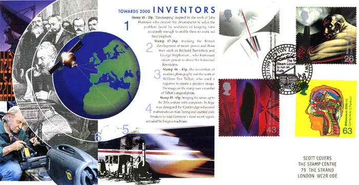 The above Royal Mail Inventors' Tale were issued on 12 January 1999 by Royal Mail and feature the following stamp designs: 20p Time; 26p Steam Power; 43p Photography; 64p Computers. The Towards 2000 first day cover with the London, Euston - First Steam Locomotive to run on rails, Special Handstamp postmark has been produced by Steven Scott and features these stamps which can make a very collectible and lovely gift.
