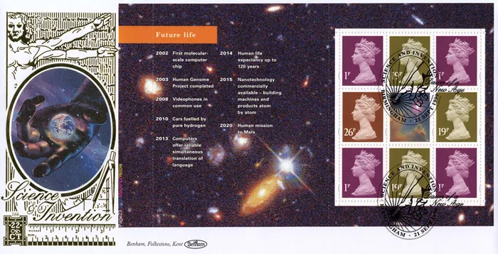 The above Royal Mail PSB: World Changers - Pane 5 were issued on 21 September 1999 by Royal Mail and feature the following stamp designs: . The Future Life first day cover with the Birmingham, Dawn of a New Age, Special Handstamp postmark has been produced by Benham and features these stamps which can make a very collectible and lovely gift.