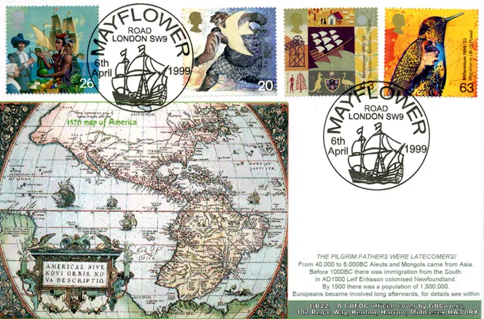 The above Royal Mail Settlers' Tale were issued on 06 April 1999 by Royal Mail and feature the following stamp designs: 20p Migration to Scotland; 26p Pilgrim Fathers; 43p Australia Colonisation; 63p Migration to UK. The Map at time of the Pilgrim Fathers first day cover with the London SW, Mayflower Road, Special Handstamp postmark has been produced by Derek Williams and features these stamps which can make a very collectible and lovely gift.