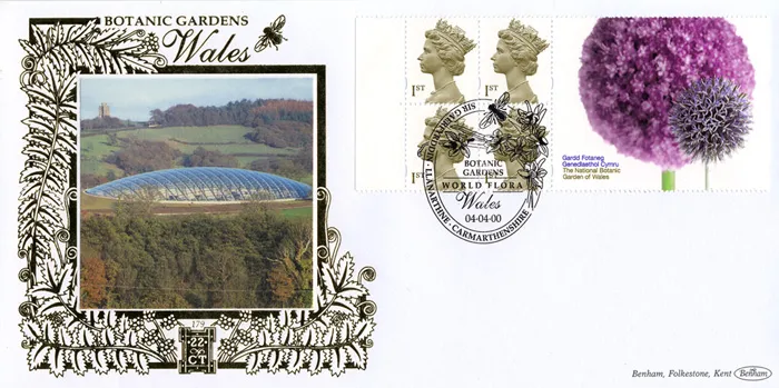 The above Royal Mail Window: Botanical Gardens were issued on 04 April 2000 by Royal Mail and feature the following stamp designs: . The The Great Glasshouse first day cover with the Llanarthne, Bee on Flowers, Special Handstamp postmark has been produced by Benham and features these stamps which can make a very collectible and lovely gift.