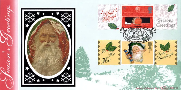 The above Royal Mail Christmas Pair: Generic 2000 (RM) were issued on 03 October 2000 by Royal Mail and feature the following stamp designs: 19p Robins; 1st Christmas Crackers. The Father Christmas first day cover with the Christmas Common, Cracker, Special Handstamp postmark has been produced by Benham and features these stamps which can make a very collectible and lovely gift.