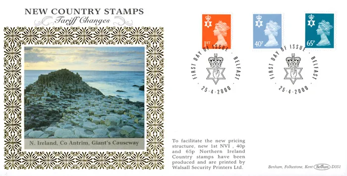 The above Royal Mail Northern Ireland 1st 40p & 65p were issued on 25 April 2000 by Royal Mail and feature the following stamp designs: . The Giant's Causeway first day cover with the Belfast, Hand of Ulster, Special Handstamp postmark has been produced by Benham and features these stamps which can make a very collectible and lovely gift.