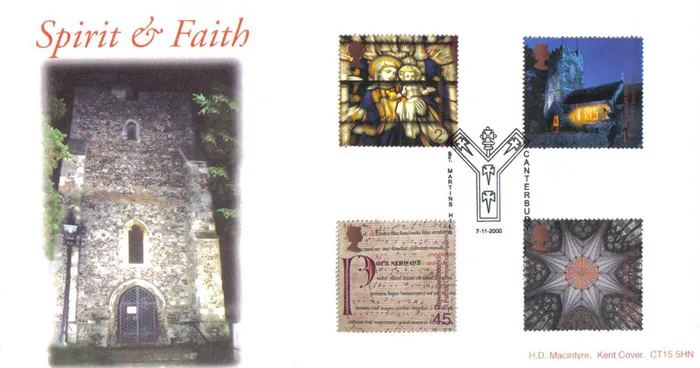 The above Royal Mail Spirit & Faith were issued on 07 November 2000 by Royal Mail and feature the following stamp designs: 2nd St. Edmundsbury Cathedral; 1st Church Floodlights; 45p Downpatrick Centre; 65p Mystery Plays, York Minster. The St Martins Hill first day cover with the Canterbury, St Martins Hill, Special Handstamp postmark has been produced by H Macintyre and features these stamps which can make a very collectible and lovely gift.
