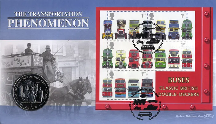 The above Royal Mail Double Decker Buses: Miniature Sheet were issued on 15 May 2001 by Royal Mail and feature the following stamp designs: 5 x 1st Class Classic Double-Decker Buses. The Horse Drawn Omnibus first day cover with the London WC, Modes of Transport, Special Handstamp postmark has been produced by Benham and features these stamps which can make a very collectible and lovely gift.