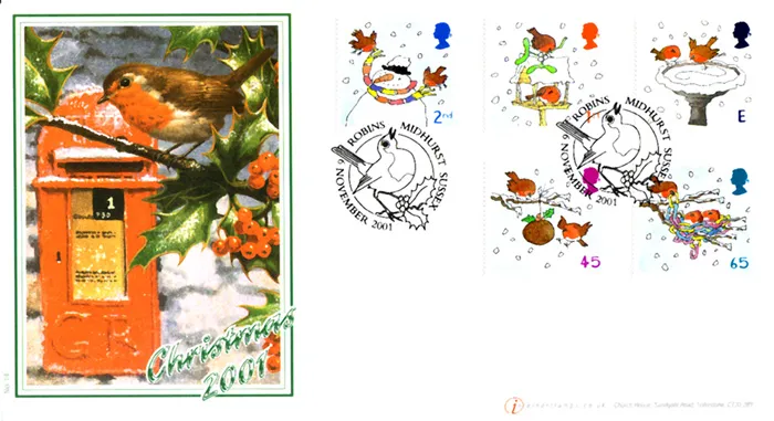 | Stamp Details: | 2nd Robins with Snowman 1st Robins on Bird Table E Robins on Ice 45p Robin's pudding 65p Lining the nest. |