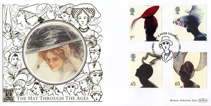 The above Royal Mail Fabulous Hats were issued on 19 June 2001 by Royal Mail and feature the following stamp designs: 1st Pip Hackett; E Dai Rees; 45p Stephen Jones; 65p Philip Treacy. The Hats through the Ages first day cover with the London EC, Hat & Mitre Court, Special Handstamp postmark has been produced by Benham and features these stamps which can make a very collectible and lovely gift.