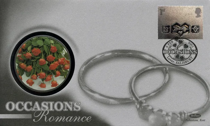 The above Royal Mail Occasions: 2001 Generic Sheet were issued on 05 June 2001 by Royal Mail and feature the following stamp designs: 1st Love; 1st Thanks; 1st Cheers; 1st Welcome; 1st New Baby plus labels. The Roses and bracelet first day cover with the Lover, Hearts, Special Handstamp postmark has been produced by Benham and features these stamps which can make a very collectible and lovely gift.