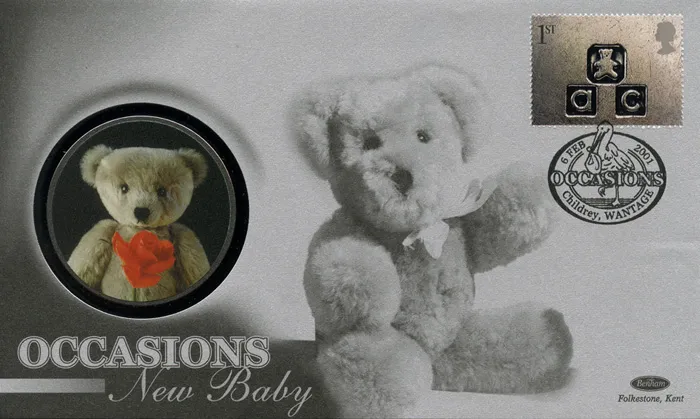 The above Royal Mail Occasions: 2001 Generic Sheet were issued on 05 June 2001 by Royal Mail and feature the following stamp designs: 1st Love; 1st Thanks; 1st Cheers; 1st Welcome; 1st New Baby plus labels. The Teddy Bear first day cover with the Childrey, Stork with baby, Special Handstamp postmark has been produced by Benham and features these stamps which can make a very collectible and lovely gift.