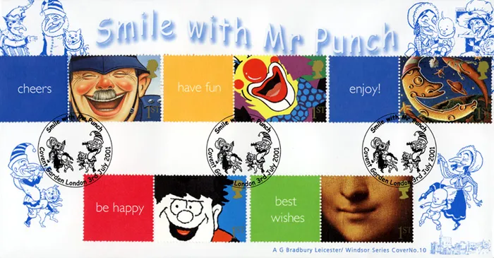 The above Royal Mail Smilers: Generic Sheet were issued on 03 July 2001 by Royal Mail and feature the following stamp designs: 1st Stan Laurel; 1st Queen of Hearts; 1st Mona Lisa; 1st Punch; 1st Teddy; 1st Dennis the Menace; 1st Mr Punch; 1st Cheshire Cat; 1st Laughing Policeman; 1st Clown; 1st Mona Lisa. The Smile with Mr Punch first day cover with the Covent Garden, Special Handstamp postmark has been produced by Bradbury and features these stamps which can make a very collectible and lovely gift.