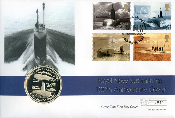 The above Royal Mail Submarines were issued on 10 April 2001 by Royal Mail and feature the following stamp designs: 2nd Vanguard Class; 1st Swiftsure Class; 45p Unity Class; 65p Holland Class. The Silver Coin Cover first day cover with the Portsmouth, 100th Anniversary, Special Handstamp postmark has been produced by Westminster and features these stamps which can make a very collectible and lovely gift.