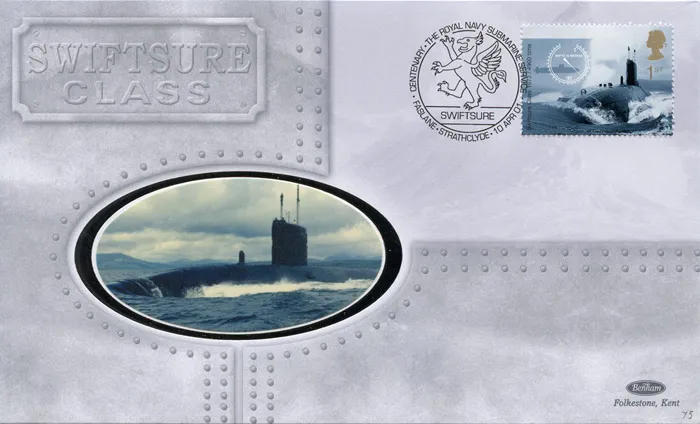 The above Royal Mail Submarines were issued on 10 April 2001 by Royal Mail and feature the following stamp designs: 2nd Vanguard Class; 1st Swiftsure Class; 45p Unity Class; 65p Holland Class. The Swifsure Class first day cover with the Faslane, Griffin, Special Handstamp postmark has been produced by Benham and features these stamps which can make a very collectible and lovely gift.
