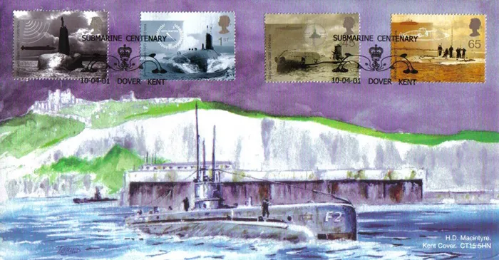 The above Royal Mail Submarines were issued on 10 April 2001 by Royal Mail and feature the following stamp designs: 2nd Vanguard Class; 1st Swiftsure Class; 45p Unity Class; 65p Holland Class. The White Cliffs of Dover first day cover with the Dover, Submariners' Emblem, Special Handstamp postmark has been produced by H Macintyre and features these stamps which can make a very collectible and lovely gift.