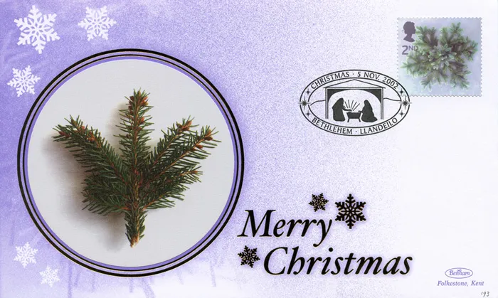 The above Royal Mail Christmas 2002 were issued on 05 November 2002 by Royal Mail and feature the following stamp designs: 2nd Spruce; 1st Holly; E Ivy; 47p Mistletoe; 68p Pine Cone. The Spruce first day cover with the Bethlehem, Away in a Manger, Special Handstamp postmark has been produced by Benham and features these stamps which can make a very collectible and lovely gift.