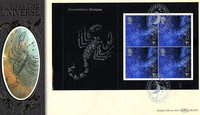 The above Royal Mail PSB: Universe - Pane 2 were issued on 24 September 2002 by Royal Mail and feature the following stamp designs: . The Constellation: Scorpius first day cover with the Armagh, Planets and Stars, Special Handstamp postmark has been produced by Benham and features these stamps which can make a very collectible and lovely gift.