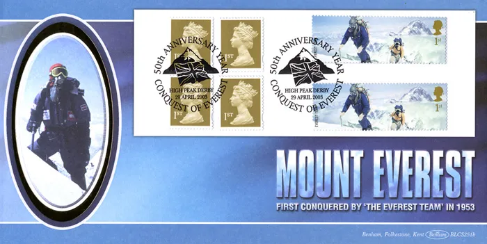 The above Royal Mail Self Adhesive: Extreme Endeavours were issued on 29 April 2003 by Royal Mail and feature the following stamp designs: . The Mount Everest first day cover with the Derby, Everest and Union Jack, Special Handstamp postmark has been produced by Benham and features these stamps which can make a very collectible and lovely gift.