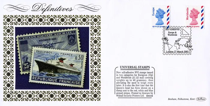 The above Royal Mail Machins (EP): Airmail were issued on 27 March 2003 by Royal Mail and feature the following stamp designs: . The French Stamps first day cover with the London, World Map, Special Handstamp postmark has been produced by Benham and features these stamps which can make a very collectible and lovely gift.