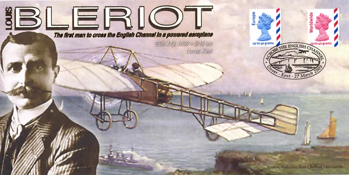 The above Royal Mail Machins (EP): Airmail were issued on 27 March 2003 by Royal Mail and feature the following stamp designs: . The Louis Bleriot first day cover with the Dover, Across the English Channel, Special Handstamp postmark has been produced by Benham and features these stamps which can make a very collectible and lovely gift.
