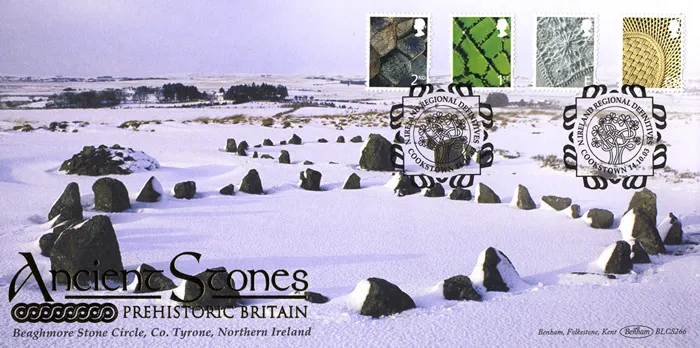 The above Royal Mail Northern Ireland (white borders) 2nd, 1st, E, 68p were issued on 14 October 2003 by Royal Mail and feature the following stamp designs: . The Beaghmore Stone Circle first day cover with the Cookstown, Flax, Special Handstamp postmark has been produced by Benham and features these stamps which can make a very collectible and lovely gift.
