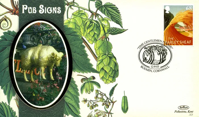 The above Royal Mail Pub Signs were issued on 12 August 2003 by Royal Mail and feature the following stamp designs: 1st The Station; E Black Swan; 42p The Cross Keys; 47p The Mayflower; 68p The Barley Sheaf. The The Golden Fleece first day cover with the Bodmin, "Time Gentlemen Please!", Special Handstamp postmark has been produced by Benham and features these stamps which can make a very collectible and lovely gift.