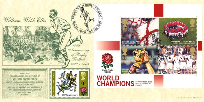 The above Royal Mail Rugby World Cup: Miniature Sheet were issued on 19 December 2003 by Royal Mail and feature the following stamp designs: 28p Flags; 28p Team Circle; 68p World Cup; 68p Rear view of team. The William Webb Ellis first day cover with the Rugby, Birthplace of Rugby, Special Handstamp postmark has been produced by Bradbury and features these stamps which can make a very collectible and lovely gift.