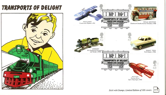 | Stamp Details: | 1st Constructor Biplane E Clockwork Double-decker 42p M1 Clockwork Locomotive 47p Ford Zephyr 68p Space Ship Eagle |