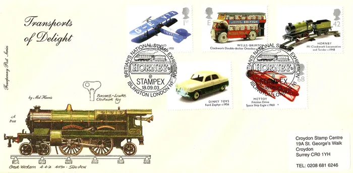 | Stamp Details: | 1st Constructor Biplane E Clockwork Double-decker 42p M1 Clockwork Locomotive 47p Ford Zephyr 68p Space Ship Eagle |