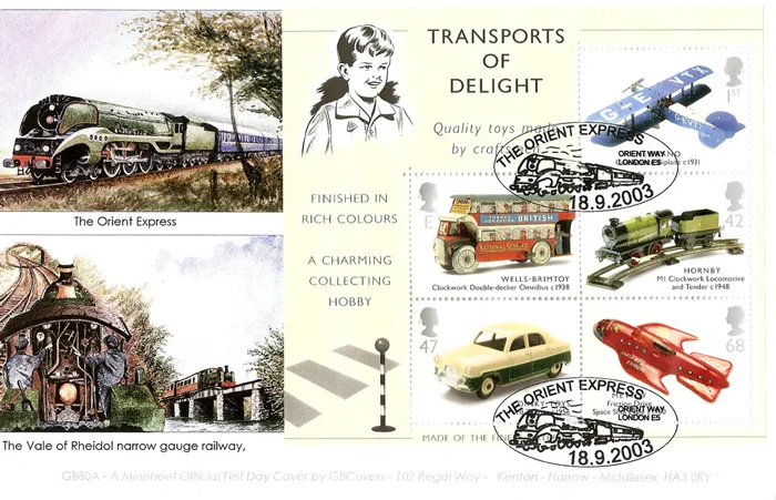 The above Royal Mail Transports of Delight: Miniature Sheet were issued on 18 September 2003 by Royal Mail and feature the following stamp designs: 1st Constructor Biplane; E Clockwork Double-decker; 42p M1 Clockwork Locomotive; 47p Ford Zephyr; 68p Space Ship Eagle. The The Orient Express first day cover with the London, The Orient Express, Special Handstamp postmark has been produced by Derek Williams and features these stamps which can make a very collectible and lovely gift.