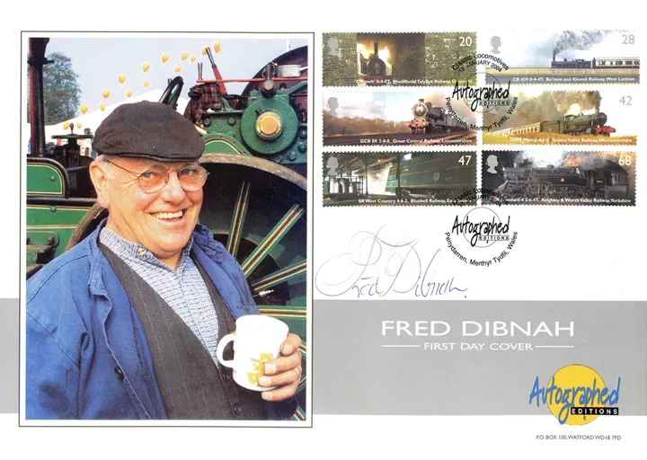 The above Royal Mail Classic Locomotives were issued on 13 January 2004 by Royal Mail and feature the following stamp designs: 20p Talyllyn Railway; 28p Bo'ness and Kinneil Railway; E Great Central Railway; 42p Severn Valley Railway; 47p Bluebell Railway; 68p Keighley and Worth Valley Railway. The Fred Dibnah first day cover with the Merthyr Tydfil, Autographed Editions, Special Handstamp postmark has been produced by Westminster and features these stamps which can make a very collectible and lovely gift.