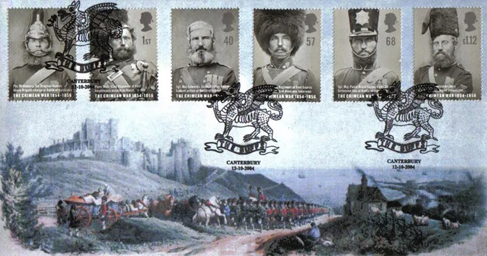 The above Royal Mail Crimean War were issued on 12 October 2004 by Royal Mail and feature the following stamp designs: 2nd Private McNamara; 1st Piper Muir; 40p Sgt Major Edwards; 57p Sgt Powell; 68p Sgt Major Poole; £1.12p Sgt Glasgow. The Manoeuvers first day cover with the Canterbury, The Buffs - Wyvern Badge, Special Handstamp postmark has been produced by H Macintyre and features these stamps which can make a very collectible and lovely gift.