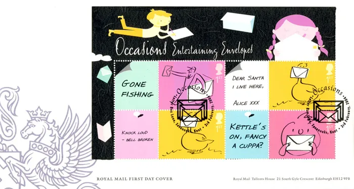 | Stamp Details: | Entertaining Envelopes: 1st Face, 1st Biplane, 1st Baby, 1st Postman, 1st Duck plus labels |
