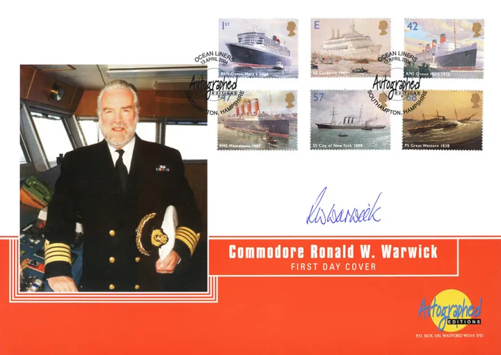 The above Royal Mail Ocean Liners were issued on 13 April 2004 by Royal Mail and feature the following stamp designs: 1st RMS Queen Mary 2; E SS Canberra; 42p RMS Queen Mary; 47p RMS Mauretania; 57p SS City of New York; 68p PS Great Western. The Commodore Warwick first day cover with the Southampton, Autographed Editions, Special Handstamp postmark has been produced by Westminster and features these stamps which can make a very collectible and lovely gift.
