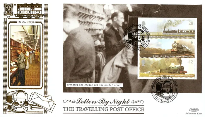 The above Royal Mail PSB: Letters by Night - Pane 2 were issued on 16 March 2004 by Royal Mail and feature the following stamp designs: . The Sorting Carriage first day cover with the Crewe, Letters by Night, Special Handstamp postmark has been produced by Benham and features these stamps which can make a very collectible and lovely gift.