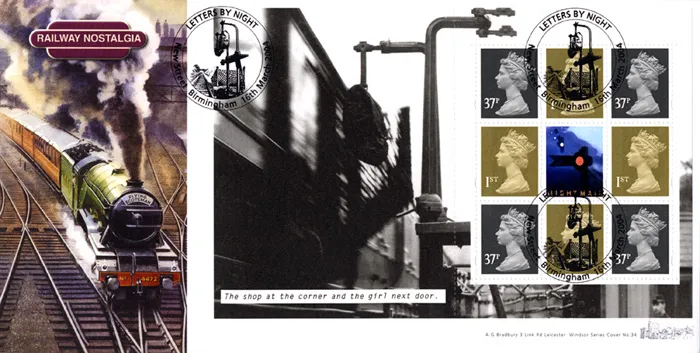 The above Royal Mail PSB: Letters by Night - Pane 4 were issued on 16 March 2004 by Royal Mail and feature the following stamp designs: . The The shop at the corner, the girl next door. first day cover with the Birmingham, New Street - Letters by Night, Special Handstamp postmark has been produced by Bradbury and features these stamps which can make a very collectible and lovely gift.