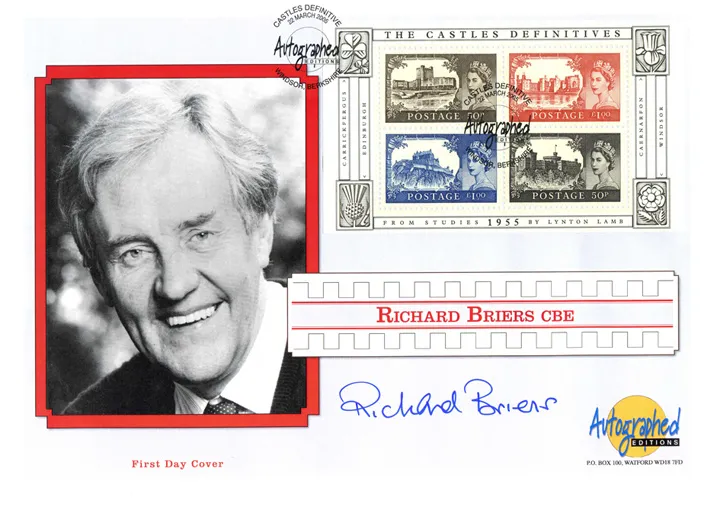 The above Royal Mail Castles: Miniature Sheet were issued on 22 March 2005 by Royal Mail and feature the following stamp designs: 50p Carrickfergus Castle; 50p Windsor Castle; £1 Caernarfon Castle; £1 Edinburgh Castle. The Richard Briers first day cover with the Windsor, Autographed Editions, Special Handstamp postmark has been produced by Westminster and features these stamps which can make a very collectible and lovely gift.