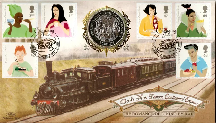 The above Royal Mail Changing Tastes of Britain were issued on 23 August 2005 by Royal Mail and feature the following stamp designs: 2nd Rice; 1st Tea; 42p Sushi; 47p Pasta; 60p Chips; 68p Apples. The Continental Express first day cover with the Victoria, Special Handstamp postmark has been produced by Benham and features these stamps which can make a very collectible and lovely gift.