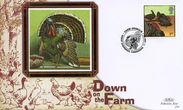 The above Royal Mail Farm Animals were issued on 11 January 2005 by Royal Mail and feature the following stamp designs: 1st British Saddleback Pig; 1st Khaki Campbell Duck; 1st Suffolk Punch; 1st Shorthorns; 1st Border Collie; 1st Chicks; 1st Suffolk Sheep; 1st Baggot Goat; 1st Norfolk Black Turkeys; 1st Embden Geese. The Norfolk Turkey first day cover with the Great Eversden, Turkey, Special Handstamp postmark has been produced by Benham and features these stamps which can make a very collectible and lovely gift.