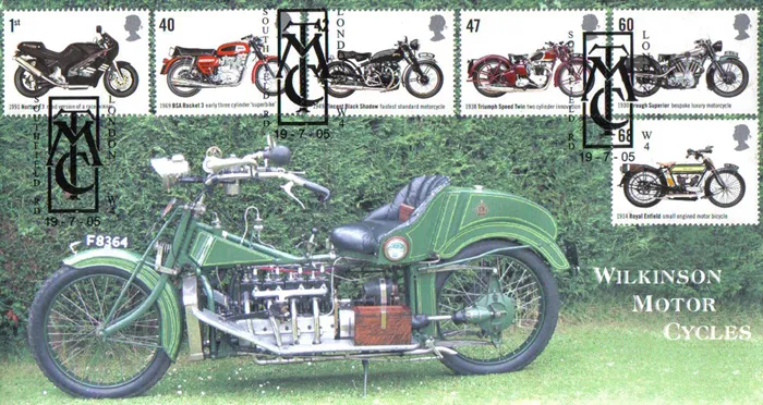 The above Royal Mail Motorcycles were issued on 19 July 2005 by Royal Mail and feature the following stamp designs: 1st Norton F1; 40p BSA Rocket 3; 42p Vincent Black Shadow; 47p Triumph Speed Twin; 60p Brough Superior; 68p Royal Enfield. The Wilkinson Motor Cycles first day cover with the London, MTC Southfield Road, Special Handstamp postmark has been produced by H Macintyre and features these stamps which can make a very collectible and lovely gift.