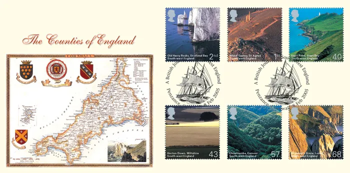 The above Royal Mail South West England were issued on 08 February 2005 by Royal Mail and feature the following stamp designs: 2nd Old Harry Rocks, Studland Bay; 1st Wheal Coates, St. Agnes; 40p Start Point, Start Bay; 43p Horton Down, Wiltshire; 57p Chislecombe, Exmoor; 68p St. James's Stone, Lundy. The Counties of England - Cornwall first day cover with the Penzance, Penzance, Ship, Special Handstamp, Ship, Special Handstamp postmark has been produced by Bradbury and features these stamps which can make a very collectible and lovely gift.