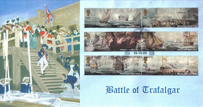 The above Royal Mail Trafalgar were issued on 18 October 2005 by Royal Mail and feature the following stamp designs: 1st The Entrepreante; 1st Nelson wounded; 42p The Entrepreante; 42p The schooner Pickle; 68p Nelson attacking in two columns; 68p Combined fleet putting to sea from Cadiz. The Lord Nelson first day cover with the Southsea, Nelson, Special Handstamp postmark has been produced by H Macintyre and features these stamps which can make a very collectible and lovely gift.