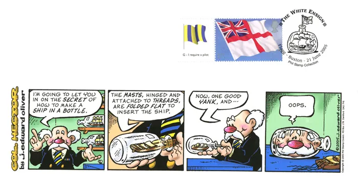 The above Royal Mail White Ensigns: Generic Sheet were issued on 21 June 2005 by Royal Mail and feature the following stamp designs: 1st White Ensign plus labels. The Col. Hector first day cover with the Flagg, Buxton, Ship in Bottle, Special Handstamp postmark has been produced by Steve Oliver and features these stamps which can make a very collectible and lovely gift.