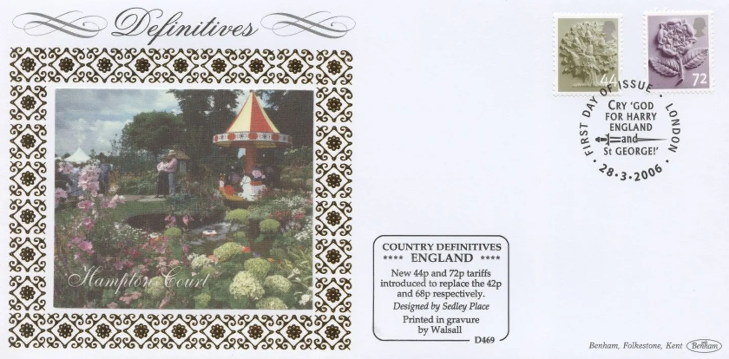 The above Royal Mail England 44p, 72p were issued on 28 March 2006 by Royal Mail and feature the following stamp designs: . The Hampton Court first day cover with the London, Special Handstamp postmark has been produced by Benham and features these stamps which can make a very collectible and lovely gift.