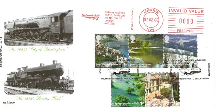 The above Royal Mail England were issued on 07 February 2006 by Royal Mail and feature the following stamp designs: 1st Cardigan Mill Valley; 1st Beachy Head; 1st St. Paul's Cathedral; 1st Brancaster; 1st Derwent Edge; 1st Robin Hood's Bay; 1st Buttermere; 1st Chipping Campden; 1st St. Boniface Down; 1st Chamberlain Square Birmingham. The No.46235 City of Birmingham first day cover with the Birmingham, See Beautiful England by Rail, Special Handstamp postmark has been produced by M Brazier and features these stamps which can make a very collectible and lovely gift.