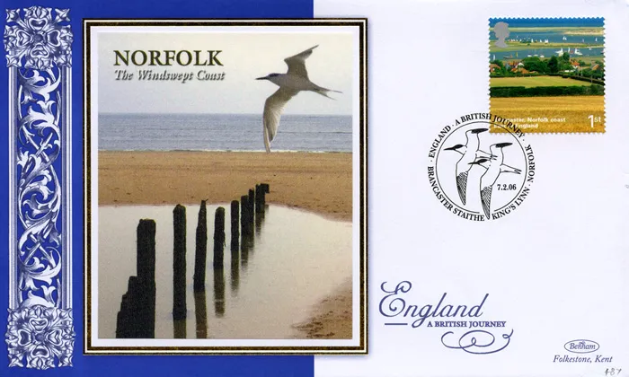 The above Royal Mail England were issued on 07 February 2006 by Royal Mail and feature the following stamp designs: 1st Cardigan Mill Valley; 1st Beachy Head; 1st St. Paul's Cathedral; 1st Brancaster; 1st Derwent Edge; 1st Robin Hood's Bay; 1st Buttermere; 1st Chipping Campden; 1st St. Boniface Down; 1st Chamberlain Square Birmingham. The Norfolk Windswept Coast first day cover with the Brancaster, Seagulls, Special Handstamp postmark has been produced by Benham and features these stamps which can make a very collectible and lovely gift.
