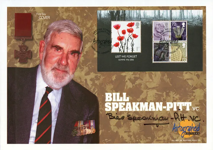 The above Royal Mail Lest We Forget 2006: Miniature Sheet were issued on 09 November 2006 by Royal Mail and feature the following stamp designs: 1st Poppy; 72p x 4 Country Pictorials. The Bill Speakman-Pitt VC first day cover with the Whitehall, Autographed Editions, Special Handstamp postmark has been produced by Westminster and features these stamps which can make a very collectible and lovely gift.