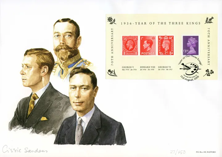 The above Royal Mail Year of the Three Kings: Miniature Sheet were issued on 31 August 2006 by Royal Mail and feature the following stamp designs: £3 Definitive. The The Three Kings first day cover with the London W1, Palette, Special Handstamp postmark has been produced by Westminster and features these stamps which can make a very collectible and lovely gift.