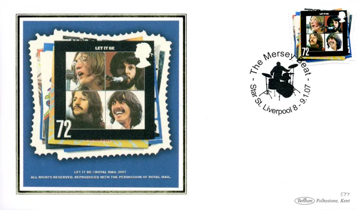 The above Royal Mail The Beatles were issued on 09 January 2007 by Royal Mail and feature the following stamp designs: 1st With the Beatles; 1st Sgt. Pepper; 64p Help!; 64p Abbey Road; 72p Revolver; 72p Let it Be. The Let it Be first day cover with the Liverpool, Drum Kit, Special Handstamp postmark has been produced by Benham and features these stamps which can make a very collectible and lovely gift.