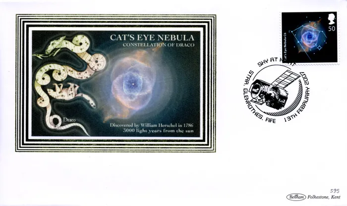 The above Royal Mail The Sky at Night were issued on 13 February 2007 by Royal Mail and feature the following stamp designs: 1st Saturn Nebula C55; 1st Eskimo Nebula C39; 50p Cat's Eye Nebula C6; 50p Helix Nebula C63; 72p Flaming Star Nebula C31; The Spindle C53. The Cat's Eye Nebula first day cover with the Star, Glenrothes, Hubble Telescope, Special Handstamp postmark has been produced by Benham and features these stamps which can make a very collectible and lovely gift.