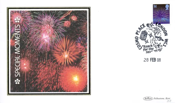 The above Royal Mail Self Adhesive: 6 x 1st Smilers Advert No. 5 were issued on 28 February 2008 by Royal Mail and feature the following stamp designs: 1st Hello; 1st Flower (Guzmania splendens); 1st Union Jack; 1st Balloons; 1st Fireworks; 1st Champagne. The Fireworks first day cover with the London WC, Reach for the Sky, Special Handstamp postmark has been produced by Benham and features these stamps which can make a very collectible and lovely gift.
