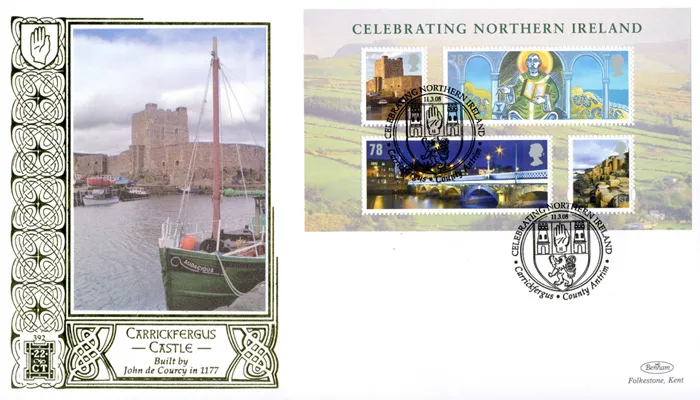 The above Royal Mail Celebrating Northern Ireland: Miniature Sheet were issued on 11 March 2008 by Royal Mail and feature the following stamp designs: 1st Carrickfergus Castle; 1st Giant's Causeway; 78p St. Patrick; 78p Queen's Bridge. The Carrickfergus Castle first day cover with the Carrickfergus, Coat of Arms, Special Handstamp postmark has been produced by Benham and features these stamps which can make a very collectible and lovely gift.